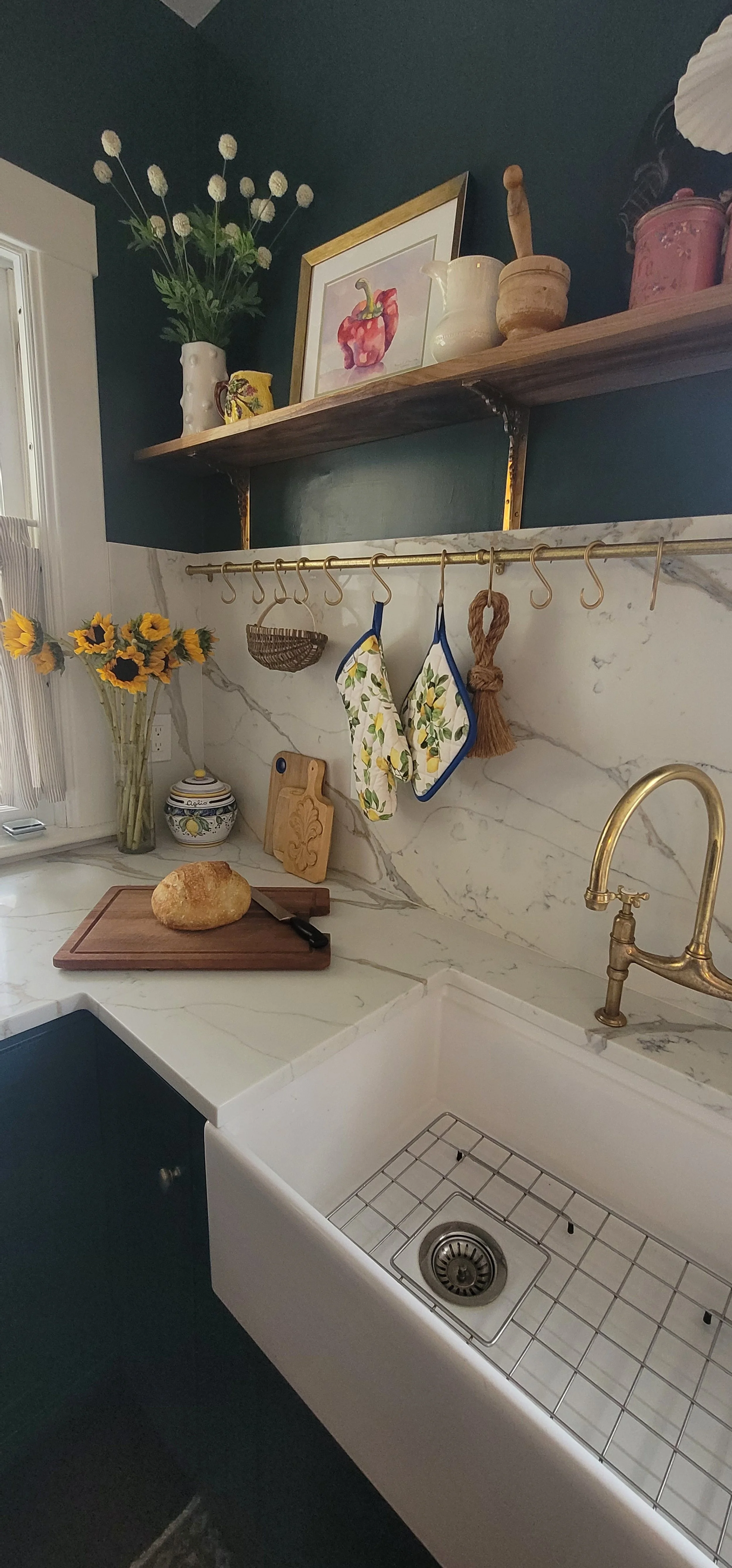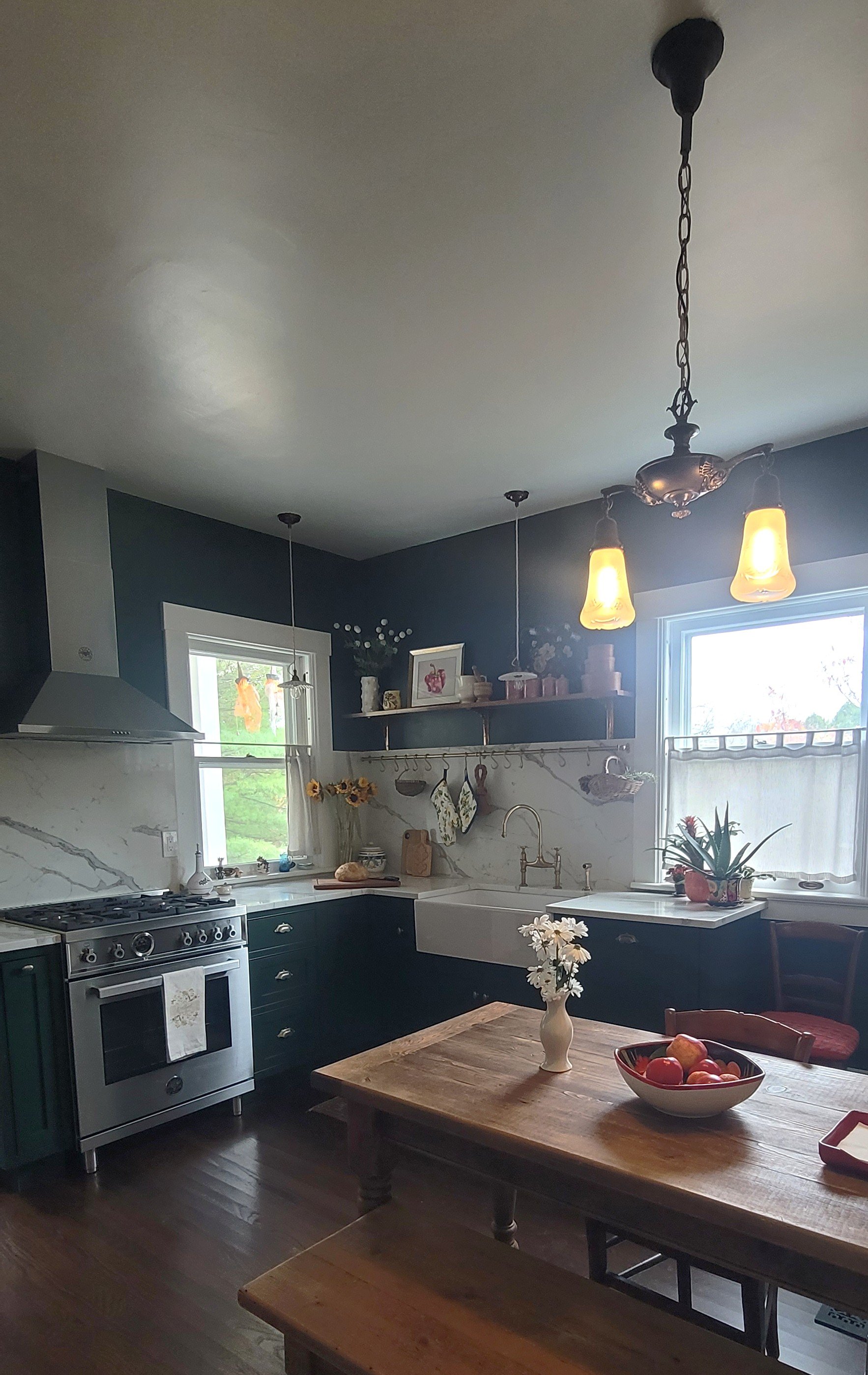 This kitchen went from dark and dated to bright and modern. The small windows, green cabinets, and old counters were replaced with slim shaker wood cabinetry, white quartz, and one large picture window that floods the room with light. Light walls, exposed beams, and a new island now create an airy, Scandinavian-inspired space connected to the outdoors.