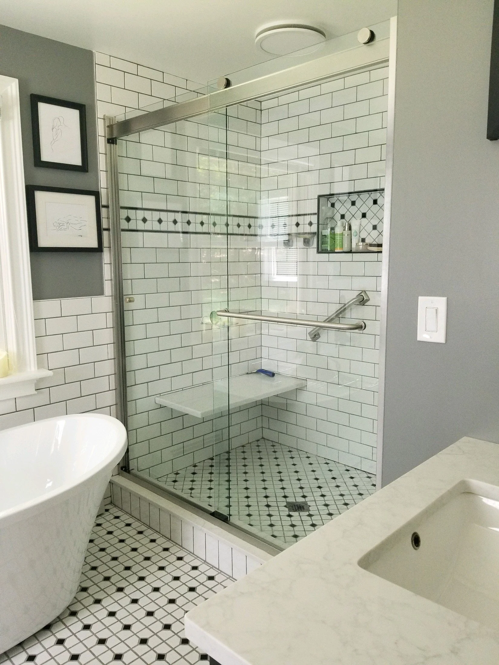 We opened up the formerly closed-off kitchen to the dining room by removing the wall and creating an L-shaped layout. The new space features a clean transitional style with shaker cabinets, white uppers and green bases, quartz counters, stainless appliances and warmwood-look
